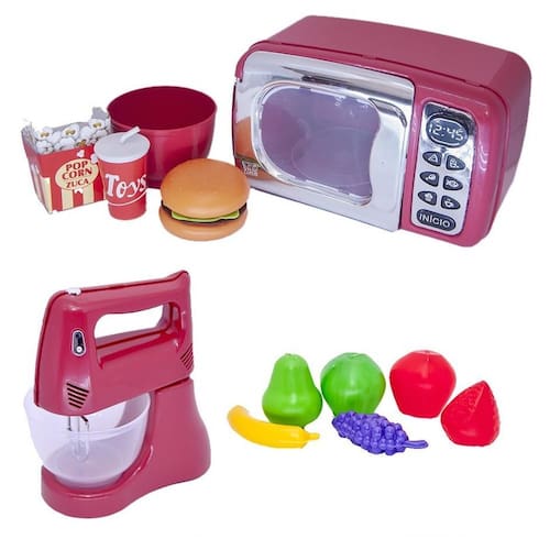 O kit vem com microondas, comidinhas, frutinhas e batedeira