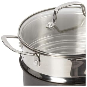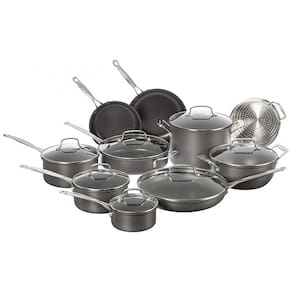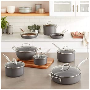 O exterior anodizado rígido é mais duro do que o aço inoxidável. Denso, não poroso e altamente resistente ao desgaste para maior durabilidade e desempenho profissional. Superfície de cozimento antiaderente premium reforçada com titânio que proporciona uma liberação duradoura de alimentos. Nenhum óleo ou manteiga são necessários para opções de cozimento com baixo teor de gordura mais saudáveis e fácil limpeza. As alças de aço inoxidável rebitadas permanecem frias no fogão e fornecem uma pegada sólida e segura. Os utensílios de cozinha devem ser lavados à mão com água quente com sabão e uma esponja ou pano de prato macio. Não coloque na máquina de lavar louça, pois os detergentes agressivos prejudicarão o acabamento externo Forno para 260 C. Tampas de vidro são seguras para forno a 176 C. Cozinhe no forno ou no fogão. Tampas de vidro temperado Vidro transparente e resistente a quebras monitore os alimentos enquanto eles cozinham. A tampa se encaixa bem para selar a umidade e os nutrientes para resultados mais saborosos. As bordas cônicas eliminam as gotas durante o derramamento Componentes incluídos 1L. Panela com tampa, 1.8L. Panela com tampa, 2.8L. Panela com tampa, 7.5L. Panela com tampa, 3.7L. Forno holandês com tampa, 3,3L. Frigideira com cabo auxiliar e tampa, frigideira de , frigideira de , frigideira de com tampa, inserção para vários vaporizadores de