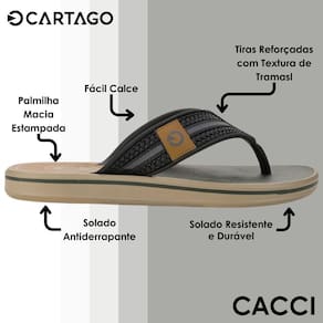 Para quem busca opções básicas e confortáveis para diversas ocasiões, o chinelo de dedo Cartago Palermo possui uma sola de altura média e o cabedal em textura de tramas dá um toque de elegância ao calce, junto às cores contrastantes.