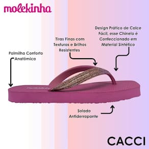 O Chinelo Infantil Molekinha foi criado para oferecer conforto, praticidade e um toque de estilo encantador para o dia a dia das pequenas. Seu design leve e anatômico garante um encaixe perfeito aos pés, proporcionando conforto a cada passo. A palmilha macia com formato anatômico se adapta à curvatura natural dos pés, tornando o uso ainda mais agradável em qualquer ocasião, seja em casa, na praia ou nos passeios em família.