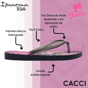 Produto delicado e cheio de charme. A palmilha conta com grafia da Barbie super estilosa e tiras translúcidas com injeção de glitter.