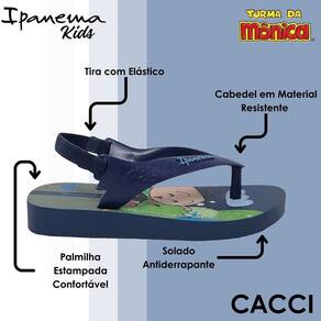 Confeccionado em borracha por completo, contém tiras tradicionais com grafia da marca em relevo, deixando o pé menos amostra. O mesmo conta com palmilha tradicional, plana para estabelecer maior conforto durante o uso, estampa das personagens da Turma da Mônica sendo de fácil higienização. Por ser infantil e/ou bebê agrega tira elástica, para manter firme nos pés. Solado antiderrapante, tendo maior aderência nos diferentes tipos de solo.