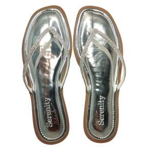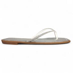 Aviso: Há divergência entre o título e as imagens fornecidas. O título menciona "Chinelo Dedo Flor de Minas Strass Metalizado PE2132/2244", mas as imagens mostram chinelos com solado quadrado, palmilha metalizada e tiras com strass, um com acabamento prateado e outro em tom nude. A descrição será gerada com base nas imagens.