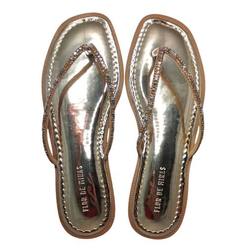 Aviso: Há divergência entre o título e as imagens fornecidas. O título menciona "Chinelo Dedo Flor de Minas Strass Metalizado PE2132/2244", mas as imagens mostram chinelos com solado quadrado, palmilha metalizada e tiras com strass, um com acabamento prateado e outro em tom nude. A descrição será gerada com base nas imagens.
