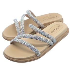 O modelo slide, caracterizado pela tira única sobre o peito do pé, oferece praticidade no calce, proporcionando um ajuste fácil e rápido. A presença do brilho adiciona um toque de glamour, elevando o visual do chinelo e tornando-o versátil o suficiente para compor tanto looks casuais quanto mais refinados.
