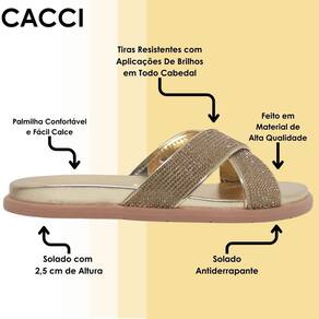 Possui duas tiras em X super resistentes, acompanhadas por aplicações de strass que a tornam mais especial e bela, seu solado é antiderrapante e trás muita segurança ao caminhar. Sua palmilha é anatômica e macia, permanecendo sempre o conforto para todas as ocasiões. Leve com você os melhores calçados, vá para todos os lugares e combine looks incríveis com ela. Adquira já a sua Cacci!