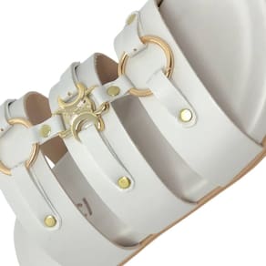 Estilo Sofisticado: As tiras grossas com detalhes metalizados dourados conferem um visual elegante, perfeito para quem quer se destacar com uma peça cheia de charme e modernidade.
