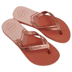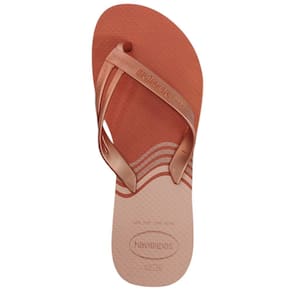 O chinelo Elegance Print da Havaianas é um modelo sofisticado. Suas tiras são lisas com detalhe vazado em um dos lados. A sola é estampada, listrada em cores complementares.