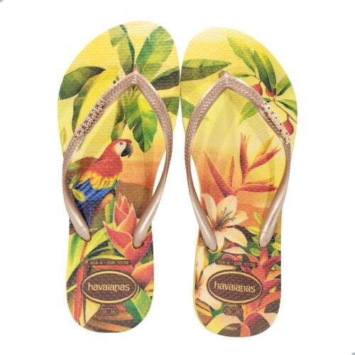 A Havaianas Slim Tropical tem o shape de tiras finas e delicadas que todo mundo ama, e sua estampa traz elementos bem tropicais de nossa fauna e flora. É todo o frescor e as cores do verão aos seus pés!