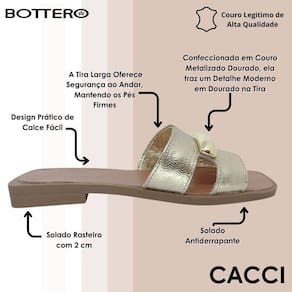 A confecção em couro metalizado proporciona um brilho discreto, que se destaca pelo detalhe elegante em dourado na tira, deixando o modelo ainda mais charmoso e atual. O solado rasteiro de dois centímetros é ideal para quem busca estabilidade e leveza, além de contar com tecnologia antiderrapante que garante passos seguros em diferentes superfícies. O calce prático facilita a rotina, sendo perfeito para quem gosta de unir beleza e praticidade em um só produto.