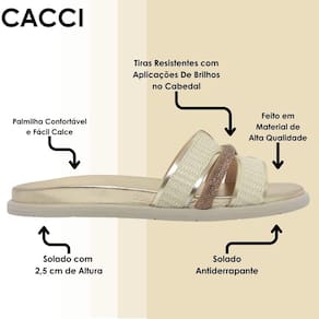 Possui tiras super resistentes, acompanhadas por aplicações de strass que a tornam mais especial e bela, seu solado é antiderrapante e trás muita segurança ao caminhar. Sua palmilha é anatômica e macia, permanecendo sempre o conforto para todas as ocasiões. Leve com você os melhores calçados, vá para todos os lugares e combine looks incríveis com ela. Adquira já a sua Cacci!