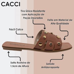 O novo Chinelo Rasteirinha da Cacci é a escolha perfeita para quem busca praticidade sem abrir mão do estilo. Com solado antiderrapante e de fácil calce, o modelo slide proporciona conforto e segurança no dia a dia. A tira única resistente com detalhes em peças douradas adiciona um toque de sofisticação, elevando o visual para qualquer ocasião.