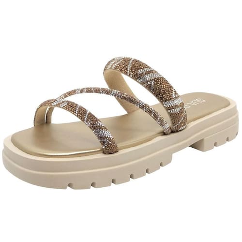 Com um solado tratorado robusto e tiras adornadas com strass, este chinelo oferece um visual contemporâneo e estiloso. Perfeito para compor looks casuais com um toque de brilho, seja em casa, na praia ou em passeios.