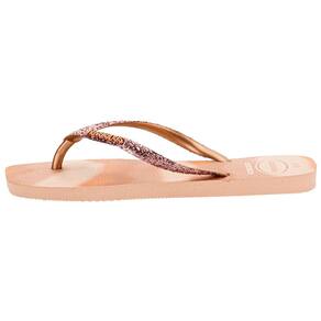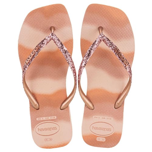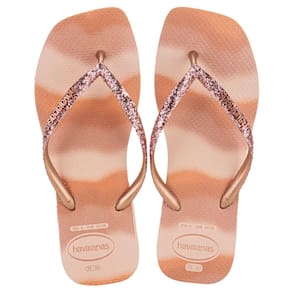 o Chinelo Feminino Slim Square Glitter Party Havaianas 4149417, feitas em borracha com acabamento em glitter para um toque de brilho. Acabamento vulcanizado, palmilha e sola em borracha, garantindo conforto e durabilidade. Perfeitas para adicionar estilo aos seus momentos casuais.