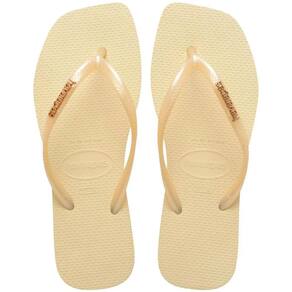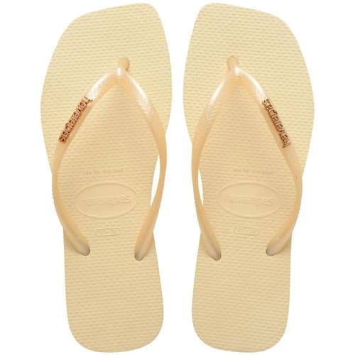 No modelo Havaianas Slim Square Logo Metallic, a sola tem bico quadrado, um estilo novo que deu super certo na Havaianas.