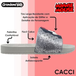 Minnie é a personagem escolhido para brilhar no Disney Mania. Delicada e encantadora na medida certa, a gáspea traz nas suas opções de cores muito brilho, através dos glitters, apliques que deixam os personagens em evidência e a assinatura da oficial Disney na sola.