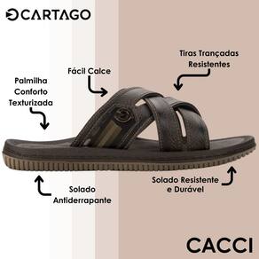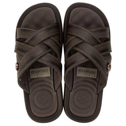 O Slide Cartago Fiji conta com uma palmilha em relevo muito confortável e o cabedal é feito em multitiras trançadas em formato de X, fácil de calçar e o acabamento de couro queimado, junto ao detalhe na lateral, dão estilo e personalidade.