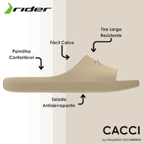 Sobre a marca: Fundada em 1986 pela Grendene, a Rider rapidamente conquistou as praias, piscinas e ruas do Brasil e países ao redor do mundo, graças a seus produtos com design inovador que carregam o DNA jovem e cultural, cheio de personalidade.
