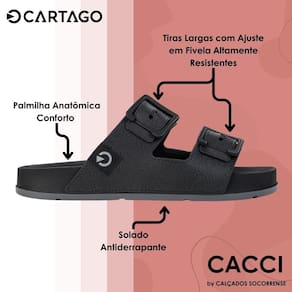 A sandália Cartago Milão tem um estilo clássico atemporal, versátil para diversos looks, fácil de calçar e muito confortável para os momentos casuais. O cabedal tem texturas modernas inspiradas em espinha de peixe, croco e efeito visual de camuflado e as diversas cores oferecem estilo em diferentes opções que fazem sucesso, perfeito para composição de looks estilosos, sem deixar de lado o conforto.