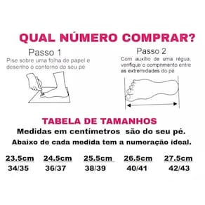 TABELA DE MEDIDA 34 - 23,5 cm 35 - 23,5 cm 36 - 24,5 cm 37 - 24,5 cm 38 - 25,5 cm 39 - 25,5 cm 40 - 26,5 cm 41 - 26,5 cm 42 - 27,5 cm 43 - 27,5 cm