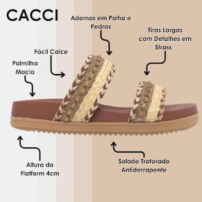 Transforme seu visual com a Papete Cacci, a escolha ideal para quem busca sofisticação e conforto sem abrir mão da praticidade. Esta papete é um verdadeiro destaque da moda, com tiras de enfeites artesanais em palha que adicionam um charme rústico e natural ao seu look. Detalhes brilhantes, como strass e pequenas pedras, conferem um toque de glamour sutil, tornando-a perfeita para diversas ocasiões, desde um passeio descontraído até um evento especial.