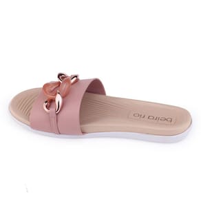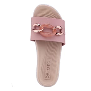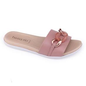 Chinelo Slide rasteiro feminino Beira Rio 8360.244 é um modelo leve. Seu cabedal fabricado em material sintético tem como destaque uma tira larga no peito do pé, com 7cm de largura e aplicação de um detalhe em corrente larga, tem o formato arredondado tanto atrás quanto na frente. Para calçar basta colocar o pé, a palmilha fixa é almofadada, com a Logo da marca. O solado baixo rasteiro possui 1cm de altura, com frisos para maior segurança.