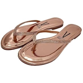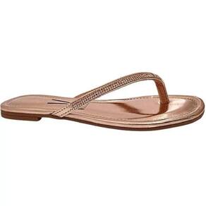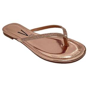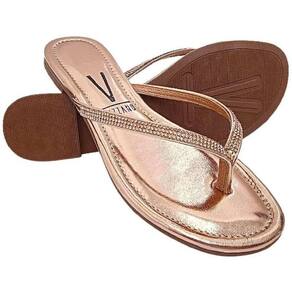 Confeccionada em material sintético metalizado, tiras no de dedo no cabedal com aplicação de strass. Possui palmilha com alta absorção de impacto e umidade, solado flexível, emborrachado com frisos antiderrapante para garantir maior segurança e conforto ao caminhar.