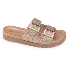 Chinelo feminino Tanara T8131 é moderno e confortável, fabricado em material sintético, apresenta toda a qualidade da marca. Este chinelo é Flatform e destaca-se em looks para passeios e também tem conforto para o dia a dia. Seu cabedal tem como destaque suas duas tiras com 3cm de largura cada contornando o peito do pé decoradas com pequenos strass rosê e duas fivelas grandes douradas, trazendo charme e proporcionando maior respirabilidade ao calçado, o bico é arredondado. O calcanhar neste modelo é aberto, a palmilha fixa é almofadada, com a Logo da marca. O Flatform com 2cm, solado com frisos para maior segurança.