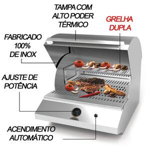 Chmglp assador a gas de bancada 55x55x54cm glp Churrasqueira de bancada a gas: Esta churrasqueira e a revolucao do churrasco, sem fumaca, sem sujeira e com um sabor ainda melhor que o churrasco a carvao. Chega de apanhar para acender o fogo, com esta churrasqueira voce apenas precisa apertar um botao e pronto, o fogo ja esta aceso. Achou pouco Esta churrasqueira cozinha mais rapido do que o normal, e mais facil de limpar e deixa a carne ainda mais macia e suculenta. Nao emite fumaca: Ao nao emitir fumaca esta churrasqueira se torna ideal para apartamentos ou ambientes com pouca ventilacao. Instale a sua churrasqueira onde quiser, sem se preocupar com sistema de exaustao ou ventilacao. O melhor sabor: Achou que a sua carne nao iria ficar boa com esta churrasqueira Achou errado. A carne fica ainda mais suculenta e macia do que o normal com esta churrasqueira. Sem contar que ela acompanha uma bacia de agua que fica abaixo da grelha para garantir que a carne fique extremamente suculenta. Caracteristicas: - fabricada de aco inox 304. - possui acendedor automatico. - possui bandeja coletora de gordura. - possui revestimento termico. - possui 1 queimador infravermelhos de alto calor. - possui fio anti-chamas certificado pelo inmetro. Garantia e suporte: Todos os produtos da saro possuem garantia total contra defeitos de fabrica. Somos os unicos que possuimos uma rede com mais de 300 assistencias tecnicas espalhadas pelo brasil. Suporte pos-venda: Precisa de ajuda Temos uma equipe de tecnicos capacitados prontos para lhe atender. Voce pode contata-los pelo nosso portal de atendimento, telefone ou e-mail. Enviamos em no maximo 24hrs apos a sua compra