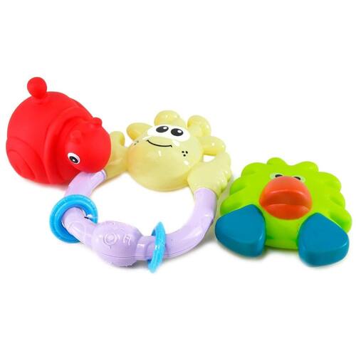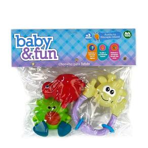 Chocalho Para Bebê 3 Peças Baby AND Fun Chocalho e Mordedor para Bebês 3 Pecas\nQuando ele precisa ficar calmo e distraído nada melhor que mordedores e chocalhos.\nNesse super kit com 2 mordedores macio com barulho quando aperta + 1 chocalho a diversão e distração vai ser garantida.\nIndicado para crianças a partir de 3 meses.\nEstimula interesse com os objetos.A\nuxilia a coordenação motora.\nEstimula a percepção através das cores.\nEspecificações:\nMarca : ARK\nTipo de material : Plástico\nCores ou Estampa : Cores diversas\nDimensões do Produto : 20 X 23 X 3,5 CM\nDimensões da Embalagem : 20 X 23 X 6 CM\nPeso Bruto (Gramas) : 0.092