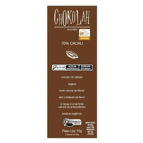 Chocolate 70% cacau com açúcar demerara orgânico chokolah 70g