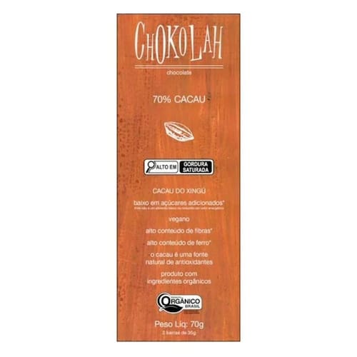 Chocolate 70% cacau baixo em açúcares orgânico chokolah 70g