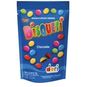 Pacote contendo 120 gramas do delicioso confeito colorido de chocolate ao leite Disqueti.