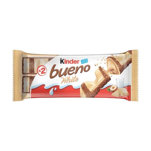 Sobre o Kinder Bueno White - Delicioso wafer, coberto de chocolate branco com recheio cremoso - Embalagens individuais perfeitas para lanches ou acompanhamento do café ou chá. - Marca renomada da Ferrero da Itália.