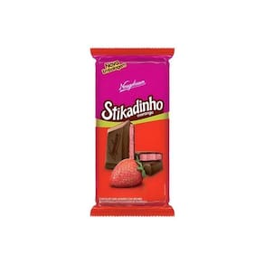 Caixa contendo 12 unidades de barra de chocolate com recheio sabor morango Stikadinho de 70 gramas cada. Peso total da embalagem 840 gramas.