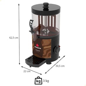 Capacidade: 3 Litros; Tensão: 220V; Potência: 1150W; Consumo: 0,115 kW/h; Cor: preta. Torneira de alta vazão que agiliza o uso e facilita a higienização; Duplo termostato para maior segurança e controle da temperatura; Estrutura em aço inox; Reservatório em polímero de alta resistência à prova de choque e removível que facilita o uso e a higienização; Com gaveta pingadeira retrátil; Pode ser para chocolate quente, caldos, leite e outros líquidos; Temperatura máxima recomendada de até 70C; Acompanha copo medidor.Porta fio
