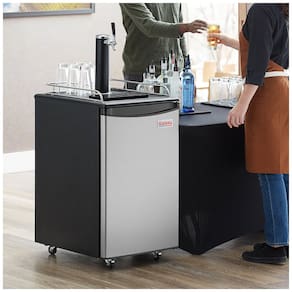 Inclui tanque de CO2 vazio de 1,13 kg, regulador duplo de CO2 e acoplador tipo "D" para conexão rápida de barris. A torre de torneira de 30 cm de altura e 7,6 cm de diâmetro permite dispensar chope gelado, com bandeja de gotejamento removível. Rodízios de 7,6 cm (dois com freio) auxiliam no transporte.