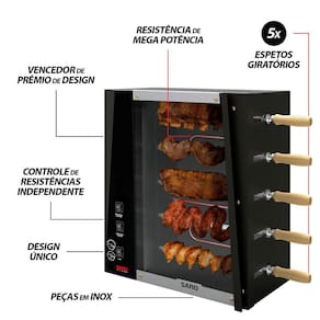 Chr11 assador rotativo de 5 espetos eletrico 127v Churrasqueira rotativa 5 espetos: Esta churrasqueira e a revolução do churrasco, sem fumaca, sem sujeira e com um sabor ainda melhor que o churrasco a carvao. Chega de apanhar para acender o fogo, com esta churrasqueira voce apenas precisa apertar um botao e pronto, o fogo ja esta aceso. Achou pouco Esta churrasqueira cozinha mais rapido do que o normal, e mais facil de limpar e deixa a carne ainda mais macia e suculenta. Nao emite fumaca: Ao nao emitir fumaca esta churrasqueira se torna ideal para apartamentos ou ambientes com pouca ventilacao. Instale a sua churrasqueira onde quiser, sem se preocupar com sistema de exaustao ou ventilacao. O melhor sabor: Achou que a sua carne nao iria ficar boa com esta churrasqueira Achou errado. A carne fica ainda mais suculenta e macia do que o normal com esta churrasqueira. Sem contar que ela acompanha uma bacia de agua que fica abaixo da grelha para garantir que a carne fique extremamente suculenta. Caracteristicas: - fabricada de aco inox 304 alto brilho. - possui acendedor automatico. - possui bandeja coletora de gordura. - possui revestimento termico. - possui queimador infravermelhos de alto calor. - possui fio anti chamas certificado pelo inmetro. Garantia e suporte: Este produto possui 1 ano de garantia total contra defeitos de fabrica, alem de suporte tecnico online diante qualquer duvida ou inconveniente.