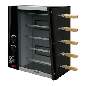 Chrglp assador rotativo de 5 espetos a gas glp Churrasqueira rotativa 5 espetos: Esta churrasqueira e a revolução do churrasco, sem fumaca, sem sujeira e com um sabor ainda melhor que o churrasco a carvao. Chega de apanhar para acender o fogo, com esta churrasqueira voce apenas precisa apertar um botao e pronto, o fogo ja esta aceso.