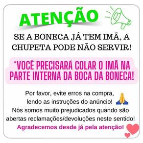 Especificações Técnicas: - Chupeta personalizada para boneca reborn - Bico com imã embutido - Acompanha 1 imã solto - Tamanho do imã solto: 12,5mm x 2mm - Recomendamos utilizar cola de silicone para fixar o imã na boneca cola não inclusa