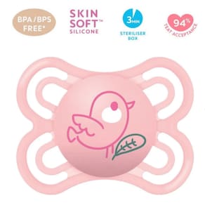 Conforto Extra: O bico simétrico em silicone SkinSoft™ proporciona uma sensação familiar ao bebê, facilitando a aceitação natural da chupeta.