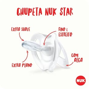 Exclusiva e única a Chupeta NUK Star possui formato que contorna o rosto do bebê de maneira suave sem cobrir o nariz do pequeno facilitando sua respiração. Seu bico em silicone possui formato assimétrico NUK Oral Fit 2.0 ou seja, 35% mais fino e 45% mais suave, além de ser mais macio e estreito. Se encaixa perfeitamente na boca proporcionando maior conforto nos movimentos naturais de sucção em cada fase do crescimento do bebê. A chupeta NUK Star possui furos de ventilação com novo design para permitir maior circulação de ar e proteger a pele sensível da criança Sua argola é ideal para anexar o prendedor de chupeta, além disso, a criança pode utilizá la para coçar a gengiva. A chupeta é livre de BPA Recomendado para crianças de 0 a 6 meses.