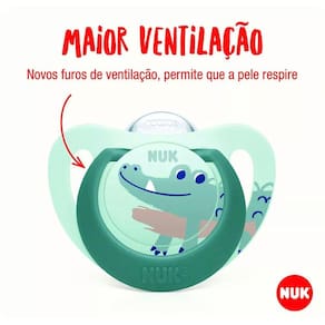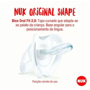 Exclusiva e única a Chupeta NUK Star possui formato que contorna o rosto do bebê de maneira suave sem cobrir o nariz do pequeno facilitando sua respiração. Seu bico em silicone possui formato assimétrico NUK Oral Fit 2.0, ou seja, 35% mais fino e 45% mais suave, além de ser mais macio e estreito. Se encaixa perfeitamente na boca proporcionando maior conforto nos movimentos naturais de sucção em cada fase do crescimento do bebê. A chupeta NUK Star possui furos de ventilação com novo design para permitir maior circulação de ar e proteger a pele sensível da criança. Sua argola é ideal para anexar o prendedor de chupeta, além disso, a criança pode utilizá-la para coçar a gengiva.