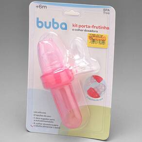 Chupeta Para Frutas Com Colher Dosadora E Bico Sugador Porta Frutinha Buba. #Bico para introdução alimentar #Desmontável e fácil de limpar #Kit porta frutinha Buba Garantia: 90 dias / Peso: 88g / Cores: Rosa ou Azul / Ref: 114126223 Dimensões: 5,5cm (C) x 4,5cm (L) x 14,5cm (A) Dimensões do recipiente: 4cm (C) x 2,5cm (L) x 7,5cm (A) Diâmetro do bucal do recipiente: 2cm Capacidade: 30ml Idade recomendada: +6 meses / Acabamento liso, livre de rebarbas. Opções de uso: 1 - Colher dosadora: Para o adulto alimentar o bebê; 2 - Bico sugador: Para a autoalimentação. Limpeza e cuidados: - Lavar com água e sabão neutro utilizando esponja macia, seguido de pano seco; - Não utilizar produtos químicos ou abrasivos na limpeza; - Pode ir ao micro-ondas sem a tampa; - Pode ir a lava-louças. Detalhes do produto: - Acompanha uma colher dosadora que pode ser substituída pelo bico para a introdução alimentar administrada pelo adulto; - O bico é perfeito para a autoalimentação, ou seja, para o bebê comer sozinho e facilitar e independência; - O recipiente em silicone macio, é sensível à pressão e libera o conteúdo na quantidade ideal; - É desmontável para facilitar a limpeza e possui tampa protetora para guardar com higiene; - Ideal para introduzir frutas e legumes ao bebê; - Livre de BPA e ftalatos. Modo de usar: 1 - Insira acolher dosadora ou o sugador no anel superior e então insira a válvula de vedação na base da colher dosadora ou sugador; 2 - Adicione o alimento escolhido no recipiente e insira-o no anel superior; 3 - Rosqueie as duas partes para fechar o recipiente. Materiais: - Polipropileno; - Silicone. O kit porta frutinha e colher dosadora da Buba é ideal para introduzir frutas e legumes na alimentação do bebê garantindo as vitaminas necessárias para um crescimento saudável. Com bico sugador indicado para frutas e legumes, a chupeta alimentadora permite que o bebê se auto alimente desenvolvendo também a coordenação motora e descobrindo novos sabores a cada dia. Possui também o bico de colher dosadora para papinhas líquidas e tampa protetora.