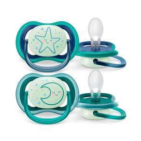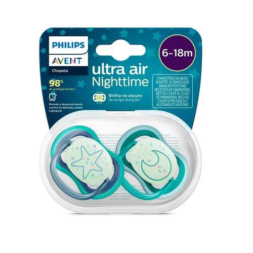 O que é e para que serve a Chupeta Philips Avent Ultra Air Nighttime 6 a 18 meses? A Philips Avent Ultra Air Nighttime é uma chupeta noturna indicada para bebês de 6 a 18 meses. Um modelo leve, que possui 4 grandes aberturas de ar, permitindo maior ventilação para a pele sensível do bebê.Conta também com um escudo desenhado para o máximo fluxo de ar. Dessa forma, a pele do bebê continua sequinha enquanto usa a chupeta.