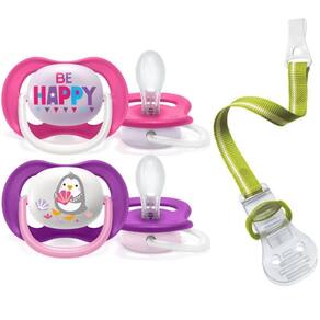 Chupeta pinguim happy + prendedor de chupeta - philips avent chupeta ultra air dupla - pinguim be happy - meninas - 6-18m - scf080/22 + prendedor de chupeta verde - scf185/05 - philips avent