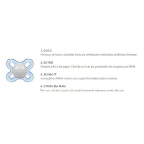 Disco: Formato côncavo. Grandes furos de ventilação e delicadas saliências internas. Botão: Rápido e fácil de segurar. Skinsoft: Inovação da MAM: macio com superfície texturizada e sedosa. MAM Design: Forma simétrica, sempre se encaixa perfeitamente na boca do bebê. Projetado com dentistas.