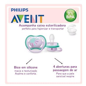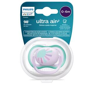 Uma chupeta leve e com aberturas de ar para a pele sensível do bebê. Grandes aberturas para permitir que a pele do bebê respire. Deixe a pele do seu bebê respirar com a Chupeta Philips Avent Ultra Air, que possui 4 grandes aberturas e um escudo leve desenhado para o o máximo de fluxo de ar, para que a pele do bebê continue seca enquanto usa a chupeta.