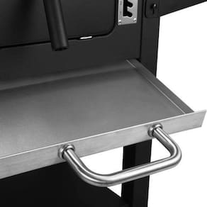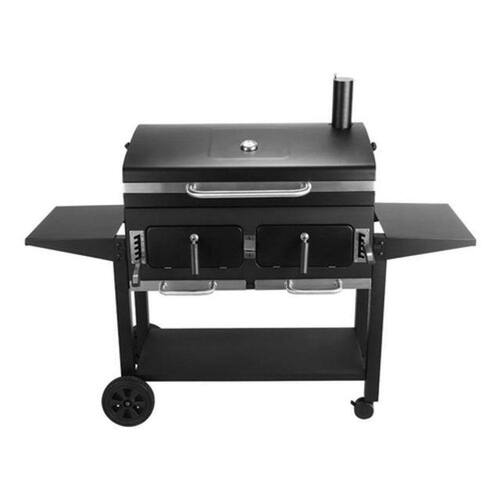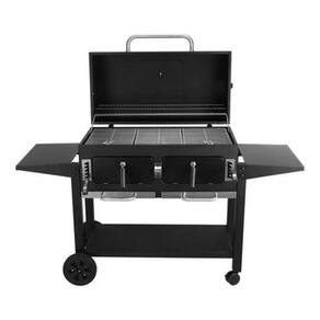 Churrasqueira com 2 lareiras independentes, chaminé, termômetro, mesass laterais dobráveis e com gancho para ferramentas, ventilação de ar na tampa e cabine de fogo, 4 rodízios de grade e cabine de calor.