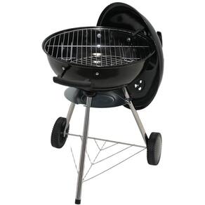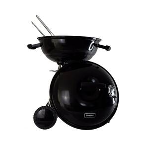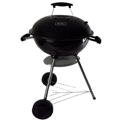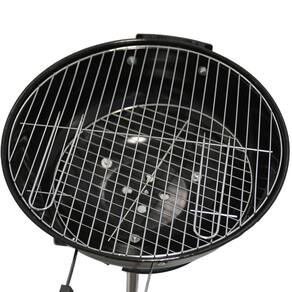 Churrasqueira a bafo portátil com design prático, ideal para jardim, camping e piqueniques. Possui duas camadas de grelha, tampa com alça e saída de fumaça, pegadores laterais, rodas para transporte, bandeja para resíduos e suporte entre as pernas.